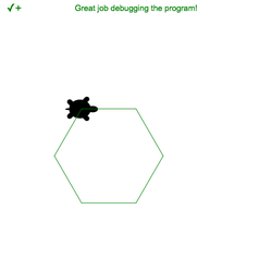 - Use the parameter name color in the .set_color() command so that the turtle draws a green hexagon.