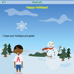 stage.set_background("winter") sprite = codesters.Sprite("person12") sprite.go_to(-125, -150) frosty = codesters.Sprite("snowman") frosty.go_to(100, -125) snow = codesters.Sprite("snowflake3") snow.go_to(100, 75) greeting = codesters.Text("Happy Holidays!") greeting.go_to(0, 200) greeting.set_color("yellow") def click(sprite): sprite.say("I hope your holidays are great!") sprite.turn_left(360) # add other actions... sprite.event_click(click) def space_bar(): sprite.jump(5) # add other actions... stage.event_key("space", space_bar)
