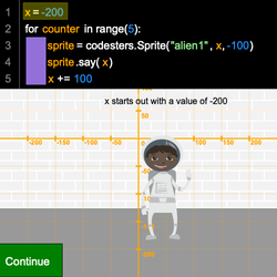 - Take a close look at the code on the stage and in the code editor. Do you see where += is used?