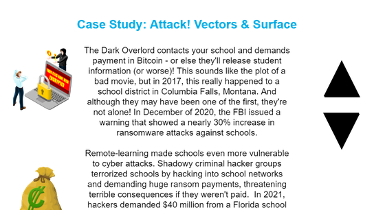 The Dark Overlord contacts your school and demands payment in Bitcoin - or else they'll release student information (or worse)! This sounds like the plot of a bad movie, but in 2017, this really happened to a school district in Columbia Falls, Montana. And although they may have been one of the first, they're not alone! In December of 2020, the FBI issued a warning that showed a nearly 30% increase in ransomware attacks against schools.\n