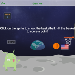 instructions = codesters.Text("Click on the sprite to shoot the basketball. Hit the basket to score a point!")