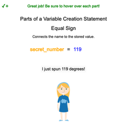 Hover over the parts of the variable creation statement on the stage to learn more about each part.