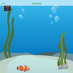 stage.set_background("underwater") sprite = codesters.Sprite("fish1", 0, -220) stage.set_gravity(4) stage.disable_floor() sprite.gravity_off() score = 0 score_board = codesters.Display(score) def interval(): x = random.randint(-260, 260) food = codesters.Circle(x, 230, 10, "sienna") # add any other actions... stage.event_interval(interval, 2) def left(): sprite.move_left(30) # add other actions... stage.event_left_key(left) def right(): sprite.move_right(30) # add other actions... stage.event_right_key(right) def collision(sprite, hit_sprite): stage.remove_sprite(hit_sprite) global score score += 1 score_board.update(score) sprite.turn_right(360) sprite.set_say_color("red") sprite.say("YUM!", 0.5) # add any other actions... sprite.event_collision(collision)