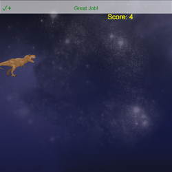 # Program variables (DON'T DELETE!!!) block_speed = -6 # controls how fast the pipes move across the stage block_gap = 200 # controls the space between the top and bottom of each pipe block_interval = 1 # controls how often a new pipe appears gravity = 8 # controls how fast the sprite falls flappiness = 5 # controls how much the sprite moves up # Store and display score score = 0 score_text = codesters.Text("Score: " + str(score), 100, 200, "yellow") ######################################################################## # ADD CODE BELOW THIS LINE # ######################################################################## stage.set_background("space") stage.disable_all_walls() sprite = codesters.Sprite("dinosaur") sprite.set_size(0.4) sprite.set_say_color("yellow") sprite.say("TAP THE SPACE BAR TO GUIDE ME THROUGH THE BLOCKS!", 3) sprite.go_to(-200, 0) stage.set_gravity(gravity) def space_bar(): sprite.jump(flappiness) stage.event_key("space", space_bar) def interval(): global score score += 1 score_text.set_text("Score: " + str(score)) stage.event_interval(interval, block_interval) def make_blocks(): pass # delete after adding indented code