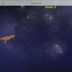 # Program variables (DON'T DELETE!!!) block_speed = -6 # controls how fast the pipes move across the stage block_gap = 200 # controls the space between the top and bottom of each pipe block_interval = 1 # controls how often a new pipe appears gravity = 8 # controls how fast the sprite falls flappiness = 5 # controls how much the sprite moves up # Store and display score score = 0 score_text = codesters.Text("Score: " + str(score), 100, 200, "yellow") ######################################################################## # ADD CODE BELOW THIS LINE # ######################################################################## stage.set_background("space") stage.disable_all_walls() sprite = codesters.Sprite("dinosaur") sprite.set_size(0.4) sprite.set_say_color("yellow") sprite.say("TAP THE SPACE BAR TO GUIDE ME THROUGH THE BLOCKS!", 3) sprite.go_to(-200, 0) stage.set_gravity(gravity) def space_bar(): sprite.jump(flappiness) stage.event_key("space", space_bar) def interval(): global score score += 1 score_text.set_text("Score: " + str(score)) make_blocks() stage.event_interval(interval, block_interval) def make_blocks(): pass # delete after adding indented code y1 = random.randint(-250, -100) # sprite = codesters.Rectangle(x, y, width, height, "color") sprite = codesters.Rectangle(250, y1, 100, 300, "red") sprite.set_gravity_off() sprite.set_x_speed(block_speed) y2 = y1 + 150 + block_gap + 150 # sprite = codesters.Rectangle(x, y, width, height, "color") sprite = codesters.Rectangle(250, y2, 100, 300, "red") sprite.set_gravity_off() sprite.set_x_speed(block_speed) def collision(sprite, hit_sprite): sprite.set_physics_off() # add any other actions... sprite.event_collision(collision)