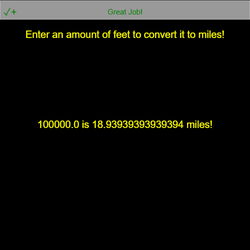 stage.set_background_color("black") instructions_text = codesters.Text("Enter an amount of feet to convert it to miles!", 0, 180, "yellow") feet = float(stage.ask("Enter an amount of feet."))100 miles = feet / 5280 result_text = codesters.Text(feet + " is " + miles + " miles!", 0, 0, "yellow")