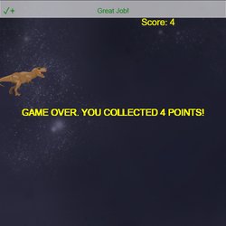 # Program variables (DON'T DELETE!!!) block_speed = -6 # controls how fast the pipes move across the stage block_gap = 200 # controls the space between the top and bottom of each pipe block_interval = 1 # controls how often a new pipe appears gravity = 8 # controls how fast the sprite falls flappiness = 5 # controls how much the sprite moves up # Store and display score score = 0 score_text = codesters.Text("Score: " + str(score), 100, 200, "yellow") ######################################################################## # ADD CODE BELOW THIS LINE # ######################################################################## stage.set_background("space") stage.disable_all_walls() sprite = codesters.Sprite("dinosaur") sprite.set_size(0.4) sprite.set_say_color("yellow") sprite.say("TAP THE SPACE BAR TO GUIDE ME THROUGH THE BLOCKS!", 3) sprite.go_to(-200, 0) stage.set_gravity(gravity) def space_bar(): sprite.jump(flappiness) stage.event_key("space", space_bar) def interval(): global score score += 1 score_text.set_text("Score: " + str(score)) make_blocks() stage.event_interval(interval, block_interval) def make_blocks(): pass # delete after adding indented code y1 = random.randint(-250, -100) # sprite = codesters.Rectangle(x, y, width, height, "color") sprite = codesters.Rectangle(250, y1, 100, 300, "red") sprite.set_gravity_off() sprite.set_x_speed(block_speed) y2 = y1 + 150 + block_gap + 150 # sprite = codesters.Rectangle(x, y, width, height, "color") sprite = codesters.Rectangle(250, y2, 100, 300, "red") sprite.set_gravity_off() sprite.set_x_speed(block_speed) def collision(sprite, hit_sprite): sprite.set_physics_off() stage.event_interval(None) message = "GAME OVER. YOU COLLECTED " + str(score) + " POINTS!" # add any other actions... sprite.event_collision(collision)