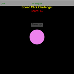 stage.set_background_color("black") score = 0 colors = ["red", "orange", "yellow", "green", "blue", "indigo", "violet"] score_text = codesters.Text("Score: " + str(score), 0, 175, "red") title_text = codesters.Text("Speed Click Challenge!", 0, 200, "yellow") circle = codesters.Circle(0, 0, 100, "yellow") circle.say("Click me as much as possible in 5 seconds!", 3) def click(sprite): score += 1 score_text.set_text("Score: " + str(score)) circle.event_click(click) stage.wait(5) circle.say("Time's up!")