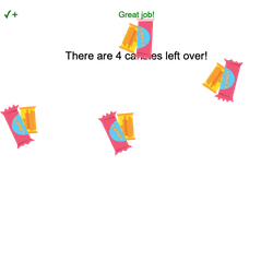 sprite = codesters.Text("There are " + str(leftovers) + " candies left over!", 0, 150)