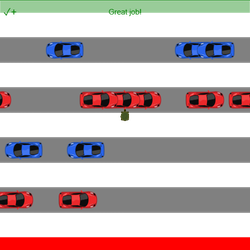 # sprite = codesters.Rectangle(x, y, width, height, "color") start = codesters.Rectangle(0, -250, 500, 50, "red") # sprite = codesters.Rectangle(x, y, width, height, "color") finish = codesters.Rectangle(0, 250, 500, 50, "green") my_list = [-150, -50, 50, 150] for value in my_list: pass # delete after adding indented code # add code here # sprite = codesters.Rectangle(x, y, width, height, "color") sprite = codesters.Rectangle(0, value, 500, 50, "gray") # sprite = codesters.Sprite("image", x, y) sprite = codesters.Sprite("turtle1", 0, -240) sprite.set_size(.2) sprite.turn_left(90) def interval(): my_var = random.choice(my_list) if my_var == -150 or my_var == 50: pass # delete after adding indented code # add your code here sprite = codesters.Sprite("car1", -400, my_var) sprite.turn_right(90) sprite.set_size(0.5) sprite.set_x_speed(2) if my_var == -50 or my_var == 150: pass # delete after adding indented code # add your code here sprite = codesters.Sprite("car2", 400, my_var) sprite.turn_left(90) sprite.set_size(0.5) sprite.set_x_speed(-2) stage.event_interval(interval, 0.5) stage.disable_all_walls() def up_key(): sprite.move_up(20) # add other actions... stage.event_key("up", up_key) def down_key(): sprite.move_down(20) # add other actions... stage.event_key("down", down_key) def left_key(): sprite.move_left(20) # add other actions... stage.event_key("left", left_key) def right_key(): sprite.move_right(20) # add other actions... stage.event_key("right", right_key) # sprite = codesters.Text("text") result = codesters.Text("") def collision(sprite, hit_sprite): sprite.go_to(0, 0) hit_sprite.hide() # add any other actions... sprite.event_collision(collision)