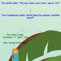 If statements, or conditionals, start with a test that compares two values. If the test statement is true, the code indented underneath runs. If the test statement is not true, the block of code underneath is skipped and the rest of the program runs.