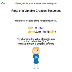 • 将鼠标悬停在舞台上的变量创建语句的部分上,以了解有关每个部分的更多信息。