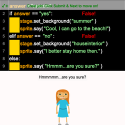 测试行下的代码仅在测试为真时运行。此代码必须在测试行下方缩进一个黄色块···· 。缩进代码在 if 语句内。