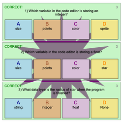 - Click Run and watch the stage. Then click on the correct answer to each question on the stage.