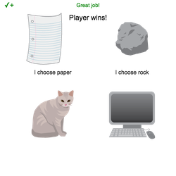 - Change the string in .set_text() to "Player wins!" since paper beats rock.