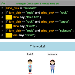 The Keyword: if·tom_pick·==·"rock"·and·alice_pick·==·"rock":¶ The Python logical operator and joins these two conditionals and tests them together!