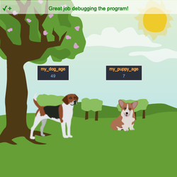 - Debug the program so that the correct variable is passed to the function and my_dog_age is calculated!