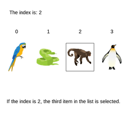 索引从 0 开始计数。所以列表中的第一个值为 [0]。列表中的第二个值为 [1]