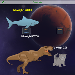 - Calculate the weight of the new animal you chose for each planet using the functions you created. Have the animal sprite say its weight for each planet.