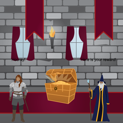sprite = codesters.Sprite("knight1", -175, -150) sprite.set_speed(2) def park_scene(): stage.set_background("park") sprite.say("I should hurry to the castle!") sprite.move_forward(550) park_scene() def bridge_scene(): stage.set_background("drawbridge") sprite.go_to(-175, -150) sprite.say("I made it!") stage.wait(2) bridge_scene() def battle_scene(): dragon = codesters.Sprite("dragon", 150, -150) sprite.say("Oh no a dragon!") sprite.move_forward(300) dragon.turn_left(360) dragon.move_down(200) sprite.say("The path is clear!") battle_scene() def reward_scene(): stage.set_background("castle") sprite.move_left(250) sprite.say(" ") wizard = codesters.Sprite("wizard", 150, -150) wizard.say("You defeated the dragon!") stage.wait(2) wizard.say("Here is your reward!") stage.wait(2) reward = codesters.Sprite("treasurechest", 0, -100) sprite.move_up(30) sprite.move_down(30) sprite.say("Hooray!") reward_scene()
