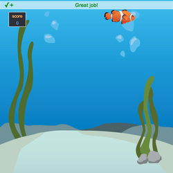STEP 9: We want our fish to appear at a random (x,y) coordinate on the stage. We'll use our rand_x and rand_y variables in the interval event to make sure that happens once every two seconds.