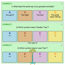 Greater Than: If your guess is > the random number, the sprite says, "Nope! Too high!"