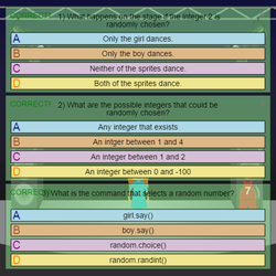 - Use the code in the editor to answer the questions on the stage. Click on the correct answers.