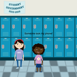 stage.set_background("schoolhallway") sprite = codesters.Sprite("person10", -125, -100) emma = codesters.Sprite("person8", 0, -125) points = 0 emma.say("Someone took my phone!") stage.wait(3) emma.say("They've been sending people mean texts, and people think I sent them!") stage.wait(3) sprite.say("What should I do?") choice = sprite.ask("a)Tell a trusted adult b)Tell people Tanya is sending the messages c)Ignore Tanya") # text = codesters.Text("text", x, y) text = codesters.Text("Hello up here.", 0, 200) if choice == "a": text.set_text("Great choice!") if choice == "b": text.set_text("It's not very nice to spread rumors!") if choice == "c": text.set_text("Don't be a bystander, stand up to bullying!") emma.move_right(500) # second scenario mike = codesters.Sprite("person12") mike.go_to(0, -125) mike.say("Someone has been harassing me online!") stage.wait(3) mike.say("I think my friend Tom might be doing it.") stage.wait(3) sprite.say("What should I do?") choice = sprite.ask("a)Laugh at Mike b)Sympathize with Mike c)Harass Tom") if choice == "a": text.set_text("Think how that makes Mike feel!") if choice == "b": text.set_text("Great job!") if choice == "c": text.set_text("Don't fight harassment by harassing someone else!")
