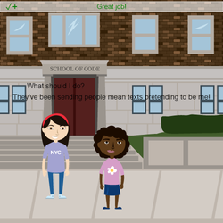 stage.set_background("schoolentrance") sprite = codesters.Sprite("person10") sprite.go_to(-125, -100) emma = codesters.Sprite("person8") emma.move_down(125) emma.say("Someone took my phone!") stage.wait(2) emma.say("They've been sending people mean texts pretending to be me!") stage.wait(2)